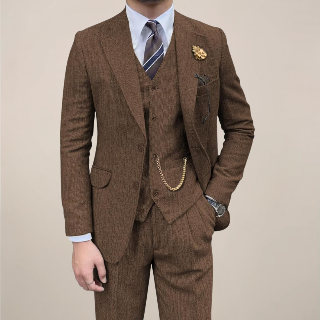 Men’s Three-Piece Brown Tweed Suit – Tailored Blazer, Waistcoat and Trousers