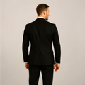 Own the room with a three-piece cut for modern black-tie moments. The single-breasted jacket features bold contrast peak lapels for a sharp, architectural line, paired with a coordinating waistcoat and slim trousers that lengthen the silhouette. Clean, minimal detailing keeps the focus on impeccable shape—ideal for evening receptions, winter weddings and formal dinners where polish matters.