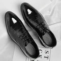 A sleek pair built for distinction, these patent Oxfords feature a polished gloss finish with refined lace-up closure and discreet brogue-inspired detailing. The structured silhouette is balanced by a thick, supportive sole, offering both elegance and durability for long wear. Perfectly suited for business, evening functions, and formal occasions, they bring sharp sophistication to any tailored ensemble.