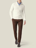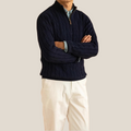 A refined half zip jumper with classic cable texture. The zip adjusts from neat crew to stand collar in seconds, giving easy warmth control, while the dense knit feels soft without bulk. Ribbed cuffs and hem hold their shape, and the regular fit layers smoothly over an Oxford shirt for desk to dinner.
