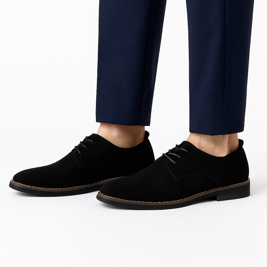 Clean, modern and endlessly versatile, these black derby shoes deliver a sharp profile with a softly matte finish, open-lace construction and neat contrast welt stitching. A lightweight, low-heel sole offers day-long comfort and grip, while the streamlined round toe keeps the look refined for work, dinners and smart-casual weekends. Pair with tailoring for a polished edge or dress them down with dark denim—either way, they unlock effortless, put-together style.