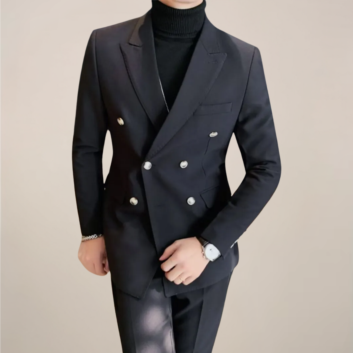 A sharp, modern blazer that commands attention. The double-breasted front with polished buttons and peak lapels creates a strong V-shape through the torso, while a shaped waist and clean shoulders keep the profile refined. Wear with matching trousers and a shirt for formal polish, or layer over a fine roll-neck for a sleek evening take.