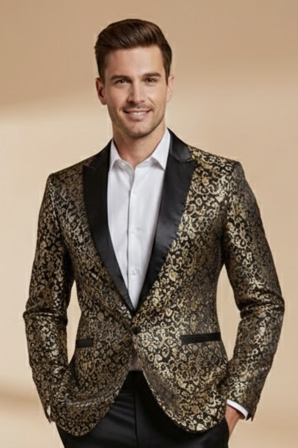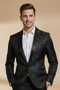 A statement piece designed to captivate, this embroidered tuxedo blazer combines timeless tailoring with bold sophistication. The intricate baroque-inspired pattern and lustrous satin lapels elevate any formal look, whether for weddings, galas, or special evening occasions. Designed for a structured, slim fit, it delivers both refinement and presence, ensuring you stand out with effortless style.