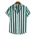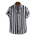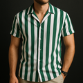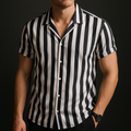 Design: Short sleeve button-up shirt with vertical stripe pattern, spread collar and straight hem