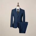Design: Three-piece suit with single-breasted blazer, matching waistcoat, and slim trousers