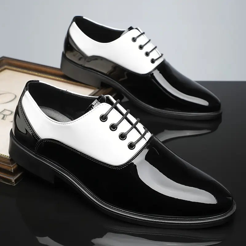 A sleek expression of modern refinement, these lace-up dress shoes feature a striking two-tone black and white patent finish that elevates traditional formalwear. The low-top silhouette and smooth contours offer a sharp, polished profile, while the durable sole ensures comfort and stability with every step. Ideal for black-tie events, weddings, and sophisticated evenings, they bring a bold yet timeless edge to the gentleman’s wardrobe.