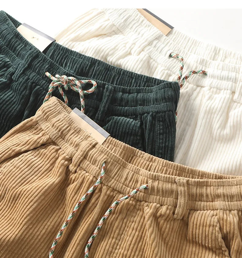 Men's Corduroy Shorts - Elasticated Drawstring Waist Wide-Wale Cord Above-Knee Length Casual Style