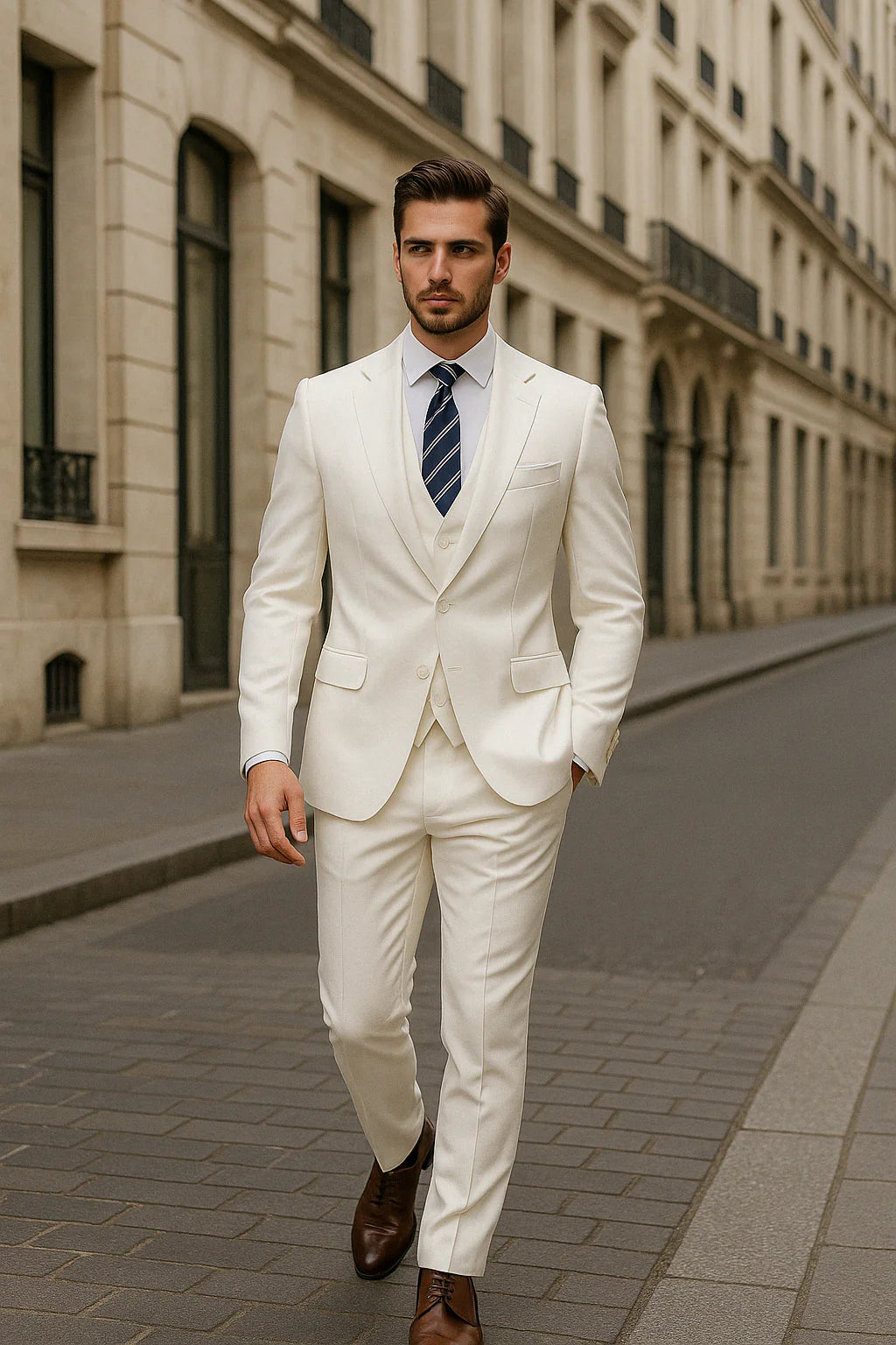 Cut for authority and clean lines, this three-piece sharpens your profile from boardroom to evening. The single-breasted jacket frames the shoulders, the five-button waistcoat streamlines the torso, and slim trousers finish a lengthening silhouette. Minimal detailing keeps it timeless and versatile for business, formal dinners and modern wedding dressing.