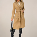 Refined and effortlessly chic, this camel long coat brings timeless sophistication to cold-weather dressing. Featuring a classic belted waist and structured lapel design, it flatters the silhouette while adding warmth and polish. Ideal for both casual strolls and evening outings, it pairs perfectly with boots and fine knitwear for a modern, elevated look.