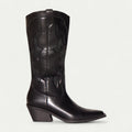 Designed to command attention with every step, these knee-high boots feature a bold Western silhouette elevated by intricate tonal embroidery. The sleek pointed toe and mid-height angled heel create a flattering profile, while the discreet side zip ensures effortless wear. A polished black finish adds timeless versatility, pairing seamlessly with dresses, skirts, or denim for a statement look season after season.