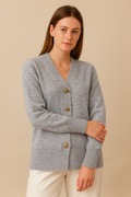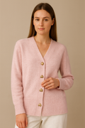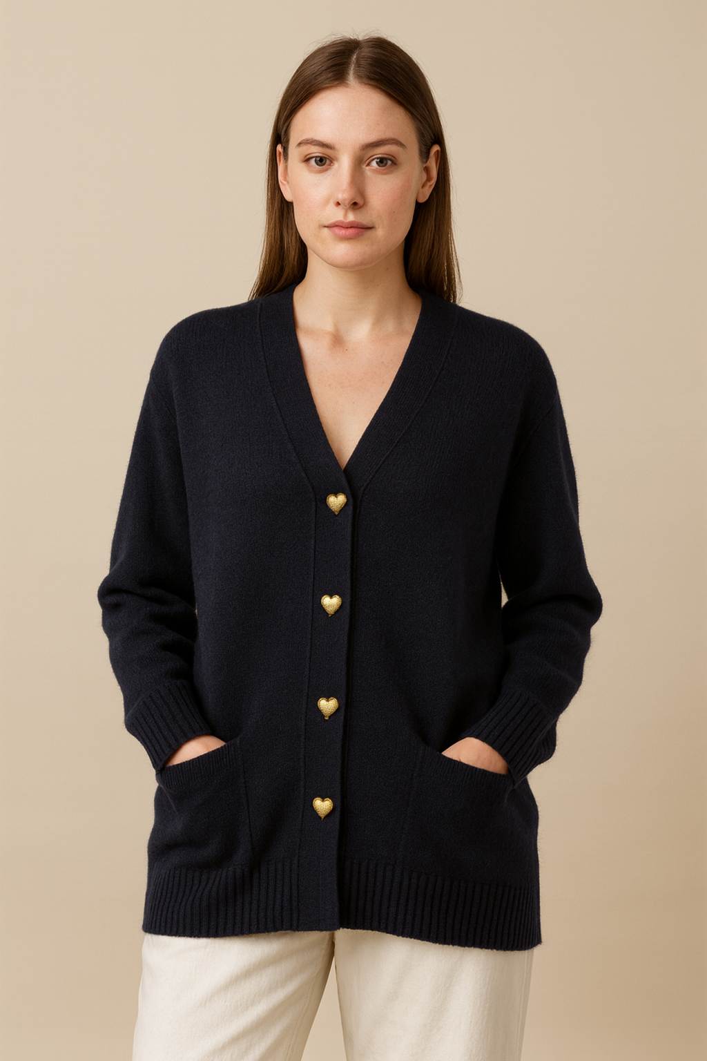 Design: V-neck cardigan with gold heart buttons, ribbed cuffs and hem, long sleeves, drop shoulder, hip length
