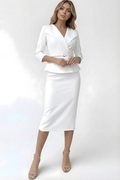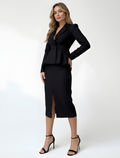 Design: Two-piece set with fitted double-breasted blazer and pencil midi skirt