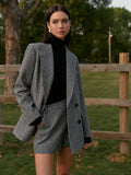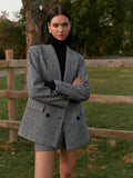 Tailored with precision, this houndstooth tweed blazer embodies timeless sophistication. Its structured double-breasted design, notched lapels, and long sleeves create a polished silhouette, while the monochrome pattern ensures effortless pairing with both smart and casual ensembles. A versatile piece, ideal for layering through the seasons, it offers refined elegance for any occasion.