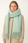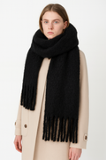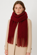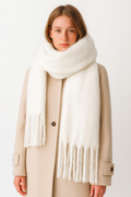 Design: Oversized winter scarf with long tassel fringe, soft-touch finish, generous length for multiple wraps