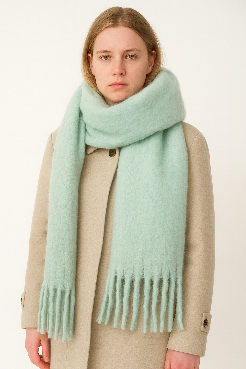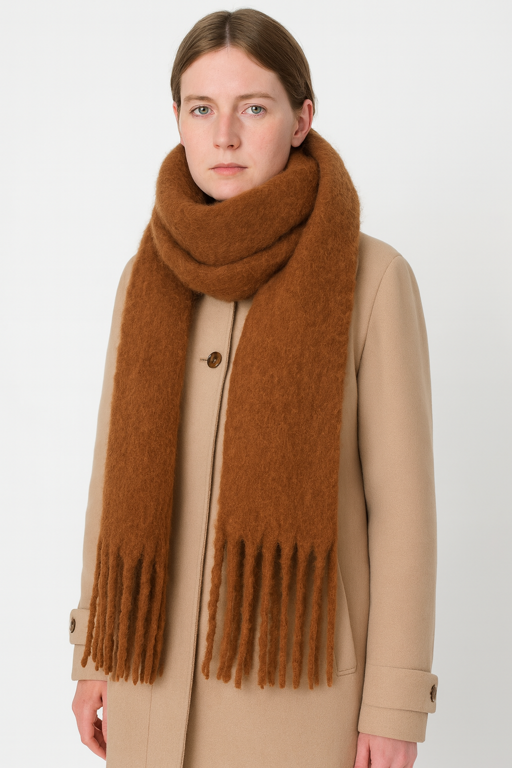 A cocooning layer with quiet luxury, this oversized wrap adds instant polish to cold-weather looks. The plush, soft-touch finish and generous length drape effortlessly over coats and knits, while the long tassel fringe lends a refined flourish. Lightweight yet warming, it’s the piece you’ll reach for on frosty commutes, weekend strolls and effortless travel days.
