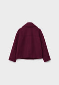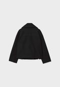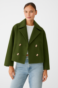 Design: Cropped short coat with wide lapels, two-row button front, welt pockets and dropped shoulders