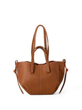 Design: Structured trapeze tote with pebbled finish, contrast stitching, dual top handles and longer shoulder straps, open-top silhouette